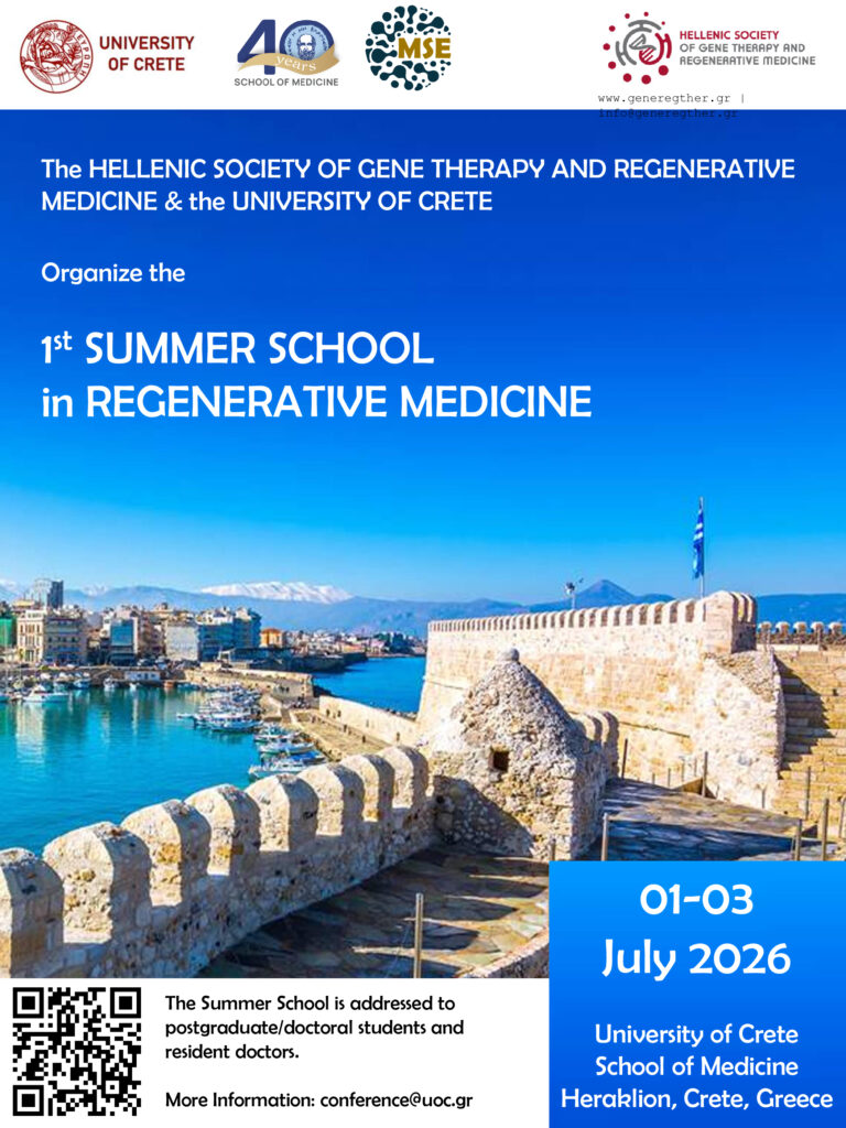 The University of Crete is pleased to welcome participants to the Summer School in Regenerative Medicine, taking place from 1 to 3 July 2026 in Heraklion. This three‑day programme brings together leading scientists, young researchers, and students for an intensive training experience in one of the most rapidly advancing fields of biomedical science.