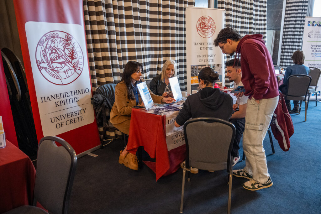 The University of Crete participated in the Heraklion fair with an exhibition booth, where institutional representatives, including the Welcome Office team, provided visitors with detailed information on undergraduate and postgraduate study programmes, as well as opportunities for academic and professional development.